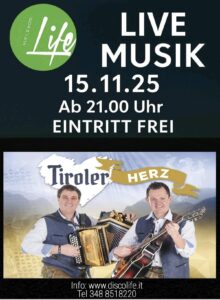 Tiroler Herz LIVE MUSIK Posted on November 13, 2025 by Life Discoteque in Termin Details Datum: 15. November 2025 21:00 – 16. November 2025 1:30